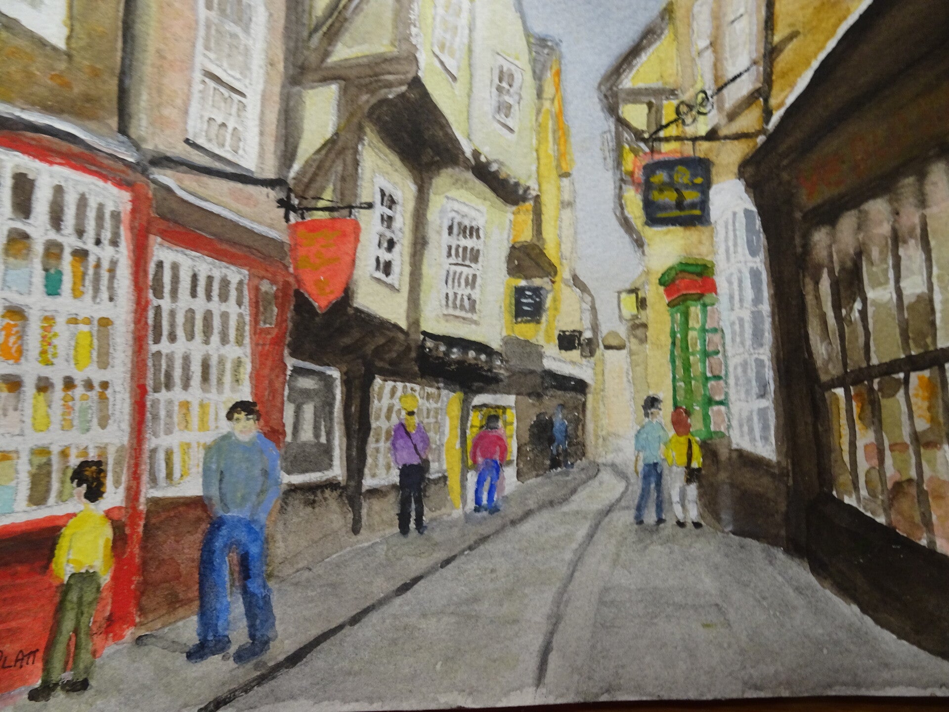 "The Shambles, York", watercolour Al Fresco dining, Southern France